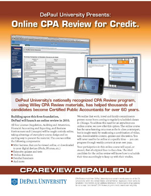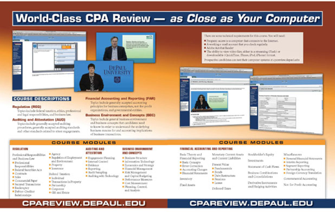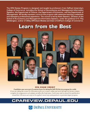 Please note: The CPA Review Program has been discontinued. As the market has shifted primarily to a handful of CPA Review providers, it has been increasingly challenging for school providers such as DePaul to be able to sustain the enrollment that it needs in order to be offered. DePaul has been preparing students to sit for the CPA exam for nearly 100 years. We hope that you will continue to find the exam review preparation that you need to achieve your goals.