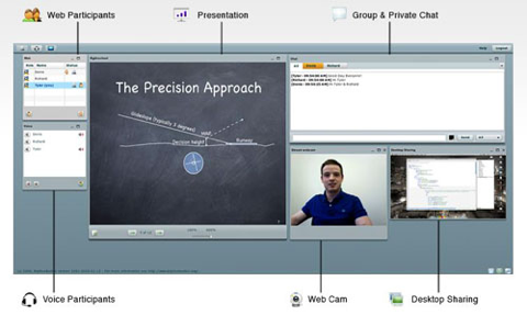 BigBlueButton is an open source solution that supports sharing of slides (PDF and PPT), video, chat, voice (using Asterisk), and desktops. The support site for BigBlueButton is a little sparse at the moment, but this looks to be an extremely useful (and cheap) way of running a webinar or videoconference.