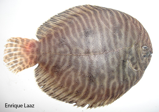 | DISTINGUISHING FEATURES: Achirus scutum differs from other species by the following characters: oval body compressed dorso-ventrally, small eyes on the right side of the head, about twenty irregular stripes forming a reticulated pattern, caudal fin with a rounded margin and dark spots (Laaz et al., 2009). |