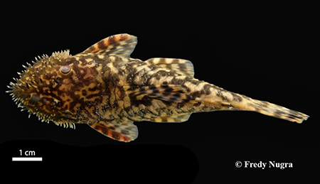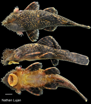 | ECOLOGY: Ancistrus clementinae known in Ecuador as the “guacuco” is a medium-sized, ecologically important, detritivorous fish (Barriga, 1994). Males defend nests in cavities where females lay large clumps of eggs. Males defend young after hatching and until they have pigment and have absorbed their yolk sacs (Burgess, 1989). Several clutches in various states of development from eggs to free-swimming larvae can be found in one nest (Sabaj et al., 1999). Sabaj et al. (1999) suggest that the tentacles may act as larval mimics and exploit a pre-existing bias in females for the presence of larvae in the nest. |