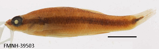 | DISTINGUISHING FEATURES: This is a small eleotrid with two dorsal fins and anteriorly positioned pelvic fins under the pectoral fins. It can be distinguished from other freshwater fishes by the presence of a horizontal black band that extends from the tip of the snout to the start of the caudal fin. |