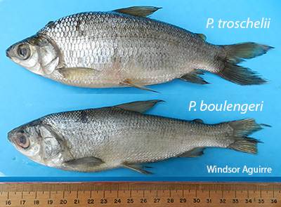 Top: Specimen of Pseudocurimata troschelii. Bottom: Specimen of Pseudocurimata boulengeri. Note difference in body depth. Also not difference in scales along lateral line. Pseudocurimata boulengeri has a significantly higher number of scales than P. troschelii. Both specimens were collected in Daule-Peripa Reservoir, northern Guayas River drainage.