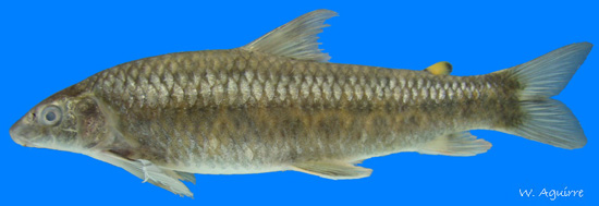 | DISTINGUISHING FEATURES: Head relatively small, mouth inferior, snout extending anteriorly over mouth, skull without fontanel, lateral line complete, adipose fin present, pectoral fins large, fan-like, caudal fin forked, dorsal fin with 12 rays, anal fin with 9-11 rays, lateral line with 39-41 scales (Glodek, 1978). Teeth are highly specialized for feeding on algae and there is substantial polymorphism of dentition (Roberts, 1974). Roberts (1974) noted that color varies with age. Juveniles tend to have midlateral longitudinal line extending the length of the body and often continuing on to the caudal fin. This line is straddled by a series of eight to ten dark blotches. In larger specimens, this pattern tends to be obscured by an overall darkening of the body. Most specimens have a dark black mark on the tip of the adipose fin (Roberts, 1974). |