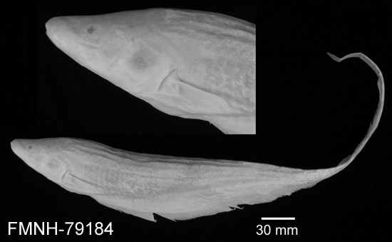 | DISTINGUISHING FEATURES: Sternopygus arenatus is an elongate gymnotiform fish. It is distinguished from other gymnotiform species in western Ecuador by the absence of a dark humeral spot; dorsal margin of snout profile straight (Hulen et al., 2004); no caudal fin or dorsal fin, free orbital present, snout short and stout, mouth terminal and jaws equal (Glodek, 1978); the anal fin is very long, the anus is close to the isthmus and eyes are covered by a protective cover (Laaz et al., 2009). |