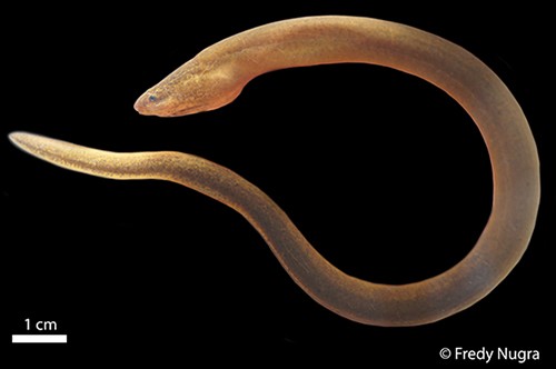 | DISTINGUISHING FEATURES: Easily distinguishable from all other freshwater fishes in western Ecuador because of its eel-like appearance and lack of fins and scales. Very elongate body with a short head and a brown coloration. |