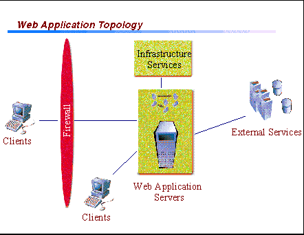 Web applications are applications that leverage Web clients (such as Web browsers), Web application servers, and standard Internet protocols. They also typically leverage existing applications and data from external non-Web services. The figure below illustrates the major elements of the Web application topology. It is important to note that the Web application server and external services are logical tiers capable of running on the same physical machine. In addition, functionality on the Web application server can be spread across multiple physical machines. Frequently, the front-end and business logic parts of a Web application are run on separate server machines. The Web application topology consists of: