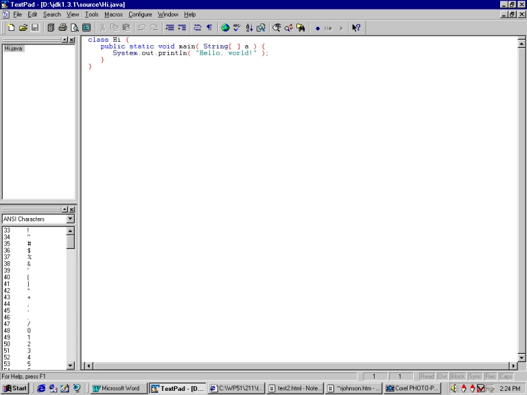 Save your program by clicking File (top left) and then Save As. In the pop up box, enter the name of the class (Hi in this example) in the File name box. TextPad will add a .java extension. In the Save as type box, choose Java. Click save. After saving your program, to compile it click on Tools and then select Compile Java: