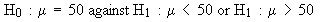 Either of these two alternative hypotheses would lead to a one-sided test. Presumably, we would want to test the null against the first alternative hypothesis since it would be useful to know if there is likely to be less than 50 matches, on average, in a box (no one would complain if they get the correct number of matches in a box or more).