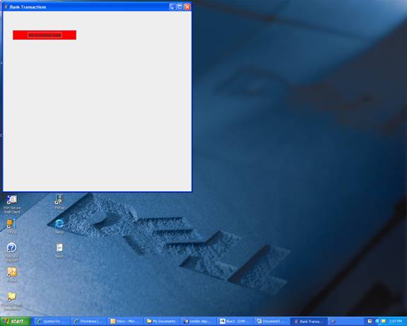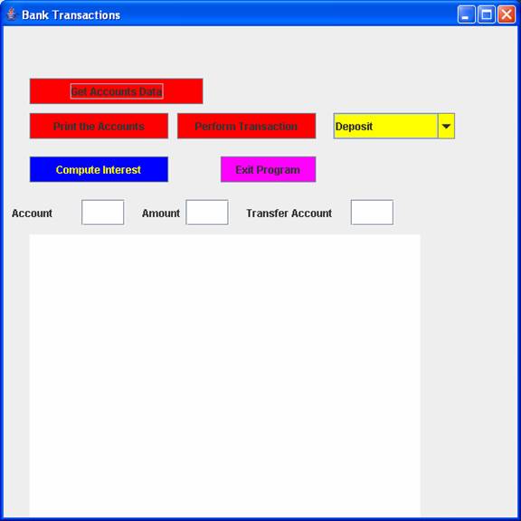 You should be able to do a better interface than this. Note that I have used a combo box for the 3 transactions, deposit, withdraw, or transfer. I could have put the compute interest as one of the types of transactions, and in fact all of the 6 actions (4 transactions and printing the accounts and exiting the program) in the combo box. It is just a matter of taste.