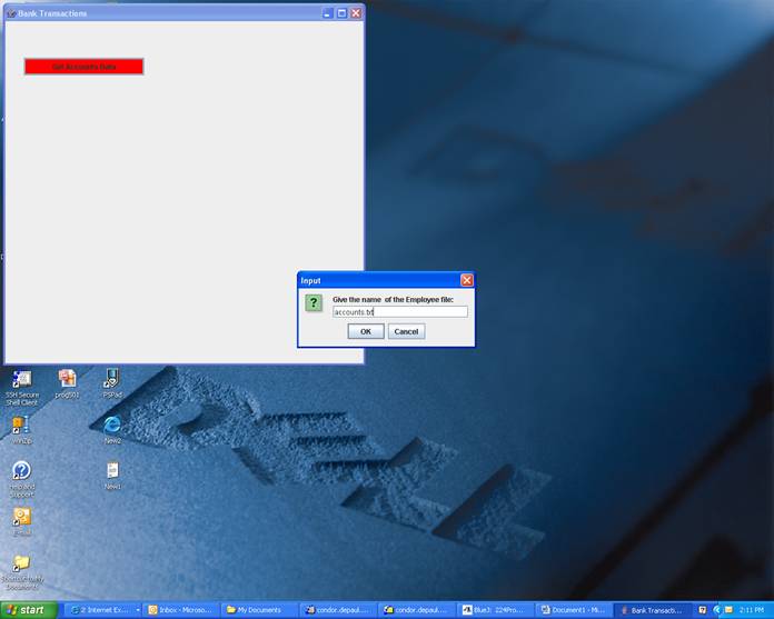 To start off, you must ask the user for the name of the data file, which in this case will be accounts.txt. However, you want to ask the user for the data. If you are doing a GUI, you could have a JButton which when clicked will ask the user for the data.