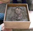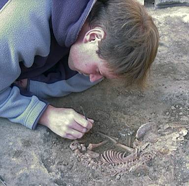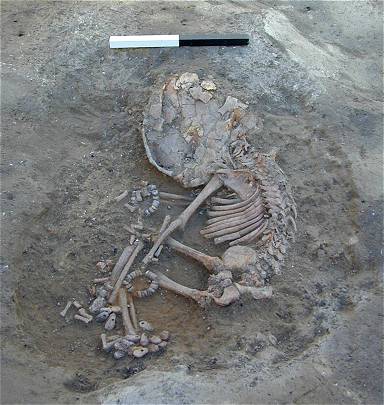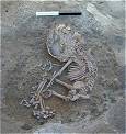 One baby (Burial 464) was buried with anklets and bracelets. Archaeologists decided to lift it as a block. The skeleton is that of an approximately 8 month old baby, lying on a mat or remnants of a basket, with two bracelets and two anklets attached to the body. Red ochre was sprinkled over the body. Click on thumbnails for larger image.