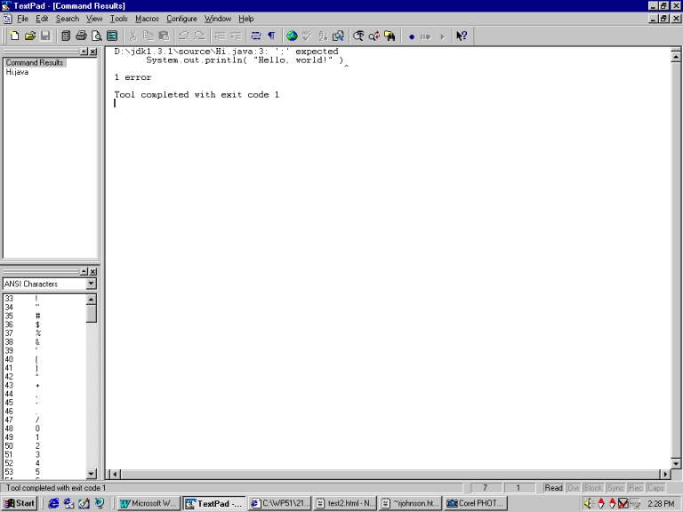 In the top, left window you can click on your program so that it reappears. After fixing it and saving it (there’s a Save button on the second line, third from the left), try compiling again. To get compiler messages in the right window, click on Command Results in the top, left window; to get your source code in the right window, click on your source code file name in the top, left window.