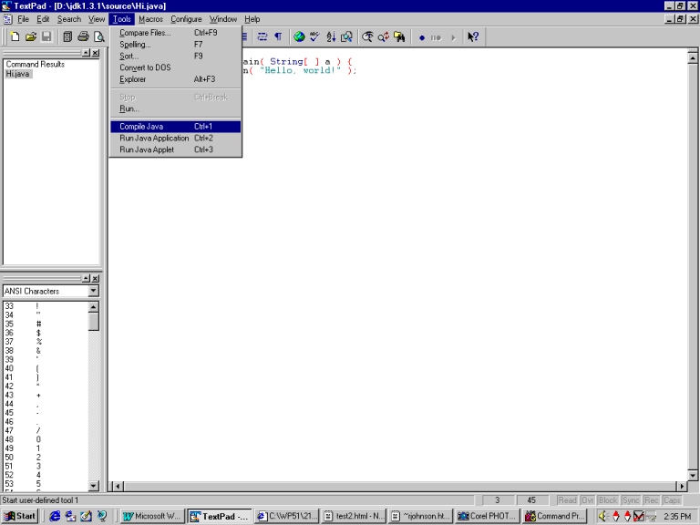Save your program by clicking File (top left) and then Save As. In the pop up box, enter the name of the class (Hi in this example) in the File name box. TextPad will add a .java extension. In the Save as type box, choose Java. Click save. After saving your program, to compile it click on Tools and then select Compile Java: